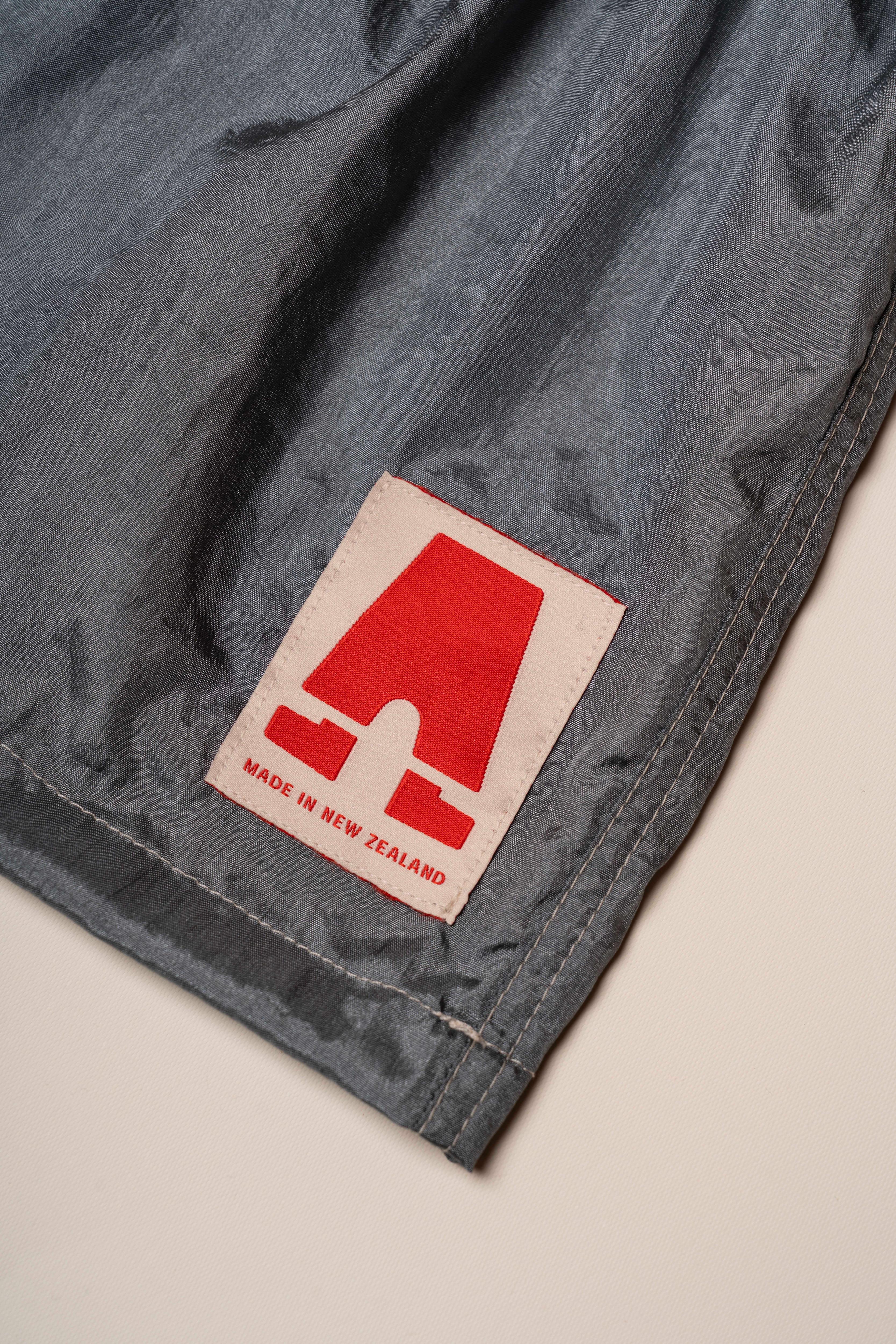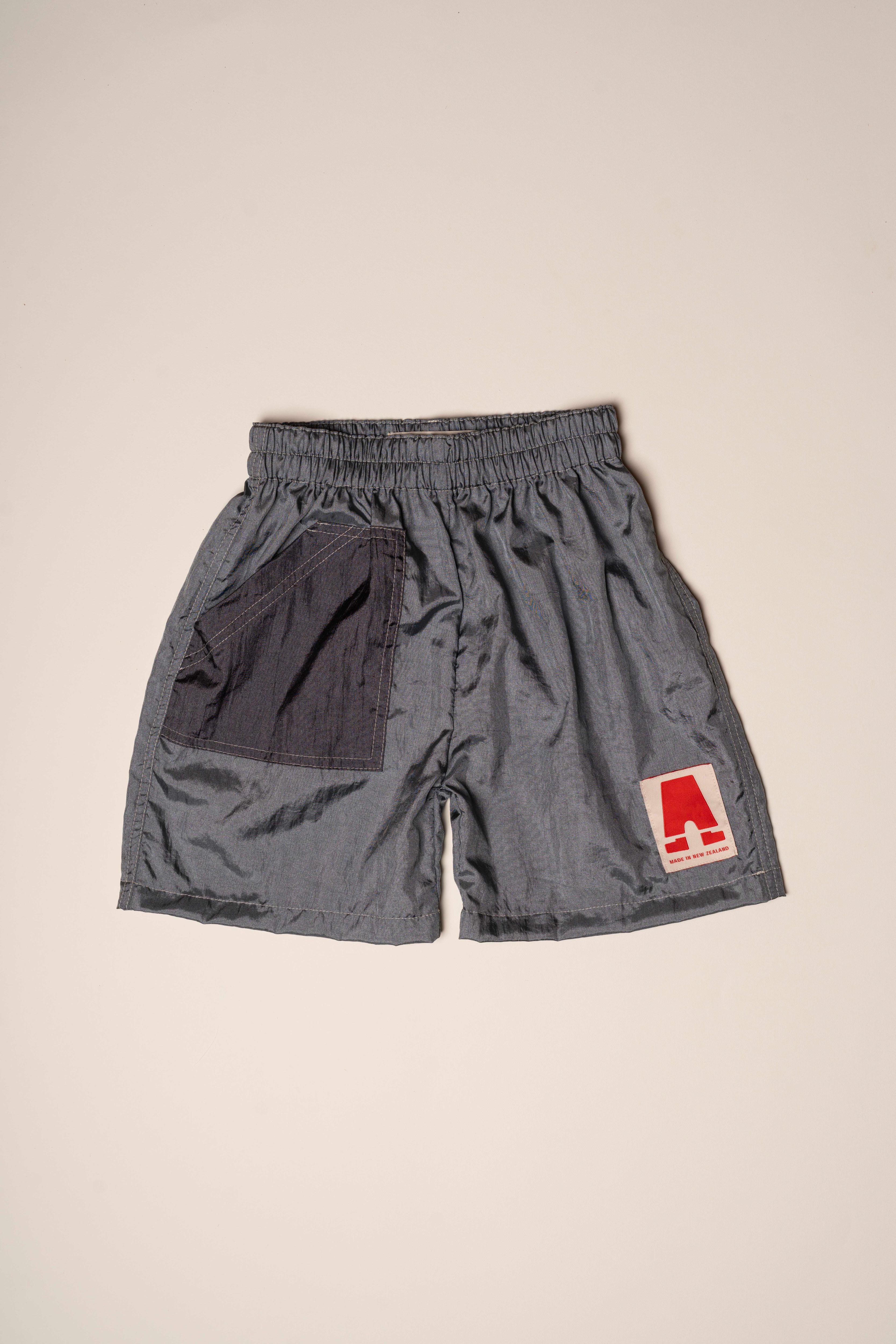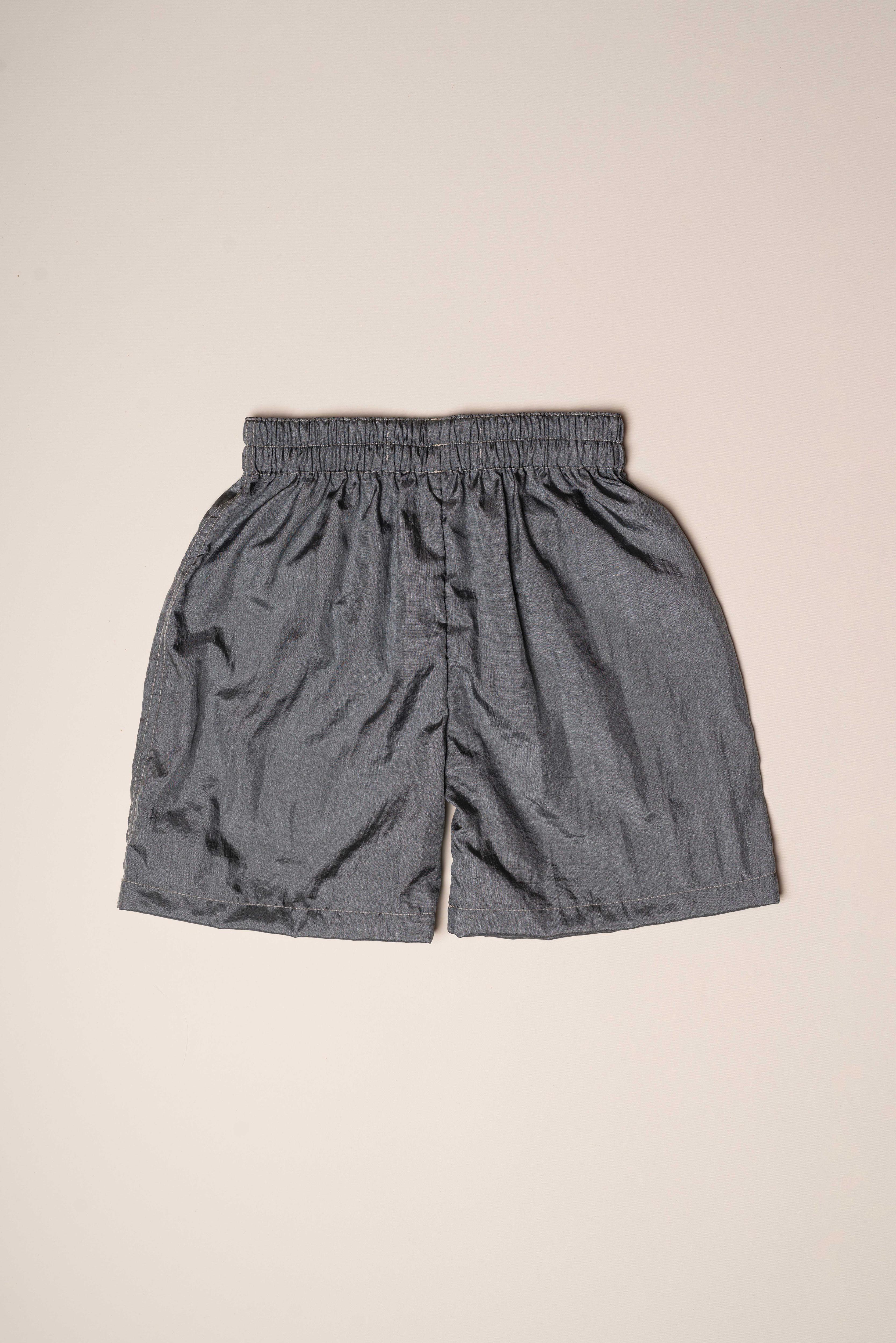 Quick drying nylon fabric featuring SHMANTS contrast pocket and branded logo on the left leg. Colour is silver with a graphite pocket. Designed and created for summer weather to bring disco level energy to small legs!